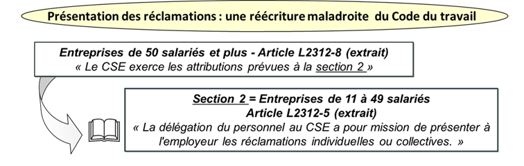 - L’élu doit donc aller à la section 2 pour se rendre compte que le CSE “a pour mission de présenter à l’employeur les réclamations individuelles ou collectives”.