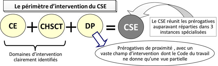 Suite à la fusion des instances représentatives du personnel, les domaines d’intervention dont le CSE a hérité sont clairement identifiés en ce qui concerne le CE et le CHSCT : économique-social d’une part, santé-sécurité d’autre part.